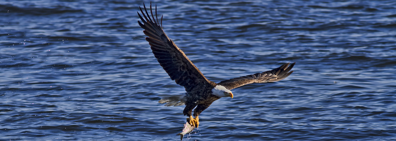 照片简介:大型猛禽美洲雕以大马哈、鳟鱼、野鸭、海鸥等动物为食,急速飞行和异乎寻常的视觉优势使其捕猎迅、猛、准!而摄影师亦因坚守的毅力、高度的审美、快速摄下海雕从空中盘旋后急速俯冲抓捕游鱼又旋即飞离海面的精彩瞬间。